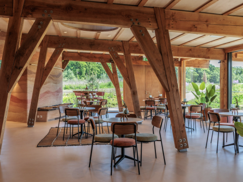 De kalkhennep muren van het paviljoen zijn een duurzaam en uniek bouwelement, gemaakt van natuurlijke vezels en kalk. Ze bieden uitstekende isolatie, reguleren op natuurlijke wijze de luchtvochtigheid en zorgen voor een prettig binnenklimaat. Bovendien zijn deze muren volledig bio-based en dragen ze bij aan het minimaliseren van de ecologische footprint van het gebouw. Door de verschillende lagen kalkhennep te kleuren met natuurlijke kleurstoffen, is een prachtige kleurschakering ontstaan die doet denken aan een doorsnede van aardlagen.